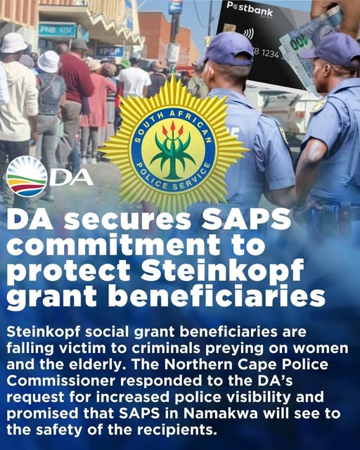 In ’n parallelle stap het die DA in die Noord-Kaap ’n formele versoek aan die Provinsiale Polisiekommissaris gerig om verhoogde sigbaarheid van die Suid-Afrikaanse Polisiediens (SAPD) in Steinkopf tydens uitbetalingsdae te verseker.