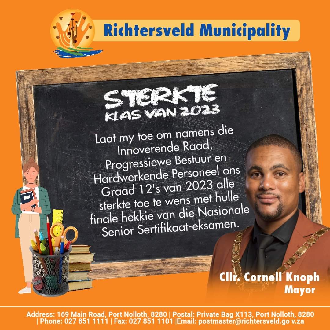 In die tussentyd wens die Richterveld munisipaliteit se burgemeester mnr. Cornell Knoph, namens die progressiewe bestuur en hardwerkene bestuur die Graad 12’s van 2023 alle sterkte toe met hulle Nasionale Senior Sertifikaat- eksamen, toe.