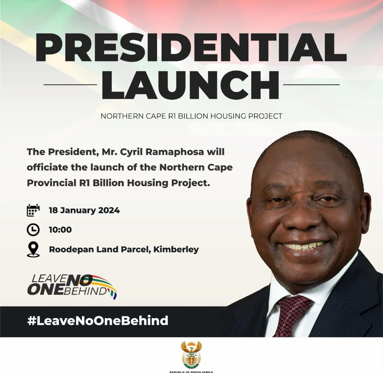 President Cyril Ramaphosa sal vandag ‘n behuisingsprojek in Kimberley, Noord-Kaap loods.