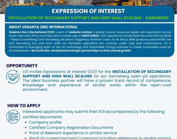 Vedanta Zinc International nooi kontrakteurs om belang te stel in sekondêre steunwerk by Gamsberg-myn