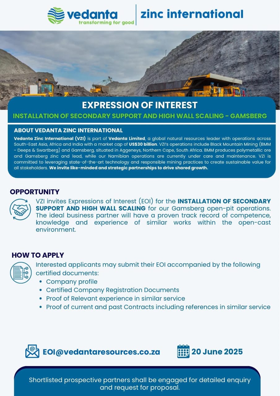 Vedanta Zinc International (VZI), ’n toonaangewende rolspeler in die Suid-Afrikaanse mynbousektor, het ’n formele oproep gerig aan geskoolde en ervare kontrakteurs om belangstelling aan te toon vir die installering van sekondêre steunstelsels en die uitvoering van hoë muurskaling by die Gamsberg-oopgroefmyn naby Aggeneys.