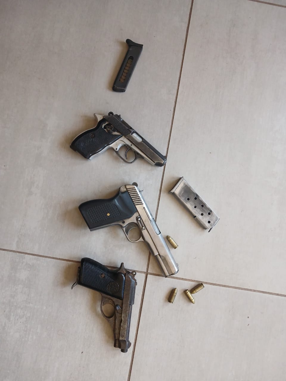 Tydens die deursoeking het die polisielede 3 vuurwapens ontdek wat in ‘n plastieksak versteek was, onder die bestuurdersitplek.